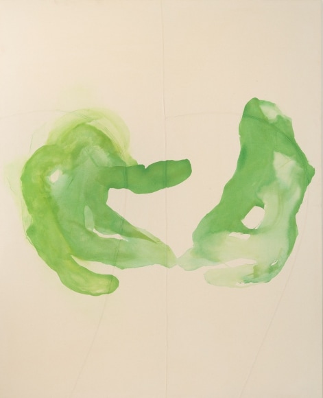 “Knowledge” features four 201 cm x 161 cm paintings on stretched cotton canvas that Gassin-Gradstein created specifically for Exhibit A London. Entitled Daat / Knowledge, Natane / To Give, Ayin / Eye, Rouah / Breathing, these works are rooted in the artist’s response to the terrorist attacks across Île-de-France in January 2015. Each painting depicts an ancient Hebrew letter chosen for its form and possible interpretation. The letters are sewn into the canvas using a unique typographical technique. Painted over the letters are hands which the artist used “… as much for their symbolic meaning as for the variety of motifs they offered,” writes critic Gérard Durozoi. Gassin-Gradstein asked locals living in a small village in Burgundy to loan him their hands and move them “however they wished” for his paintings. Their hands “are praying for knowledge,” Gassin-Gradstein explains. The colour he selected for each painting is also symbolic. Each pigment undergoes successive stages which react differently to the canvas. This process represents a transformation based on a real situation.